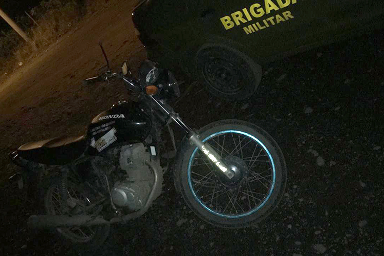Os brigadianos tentaram parar um motociclista em atitude suspeita. O condutor da moto de placa INT 0616 não obedeceu a ordem de parada e tentou fugir do local em alta velocidade. A BM realizou acompanhamento durante cinco quilômetros e acabou encontrando a moto abandonada nas proximidades de um matagal. O veículo foi recolhido ao guincho.