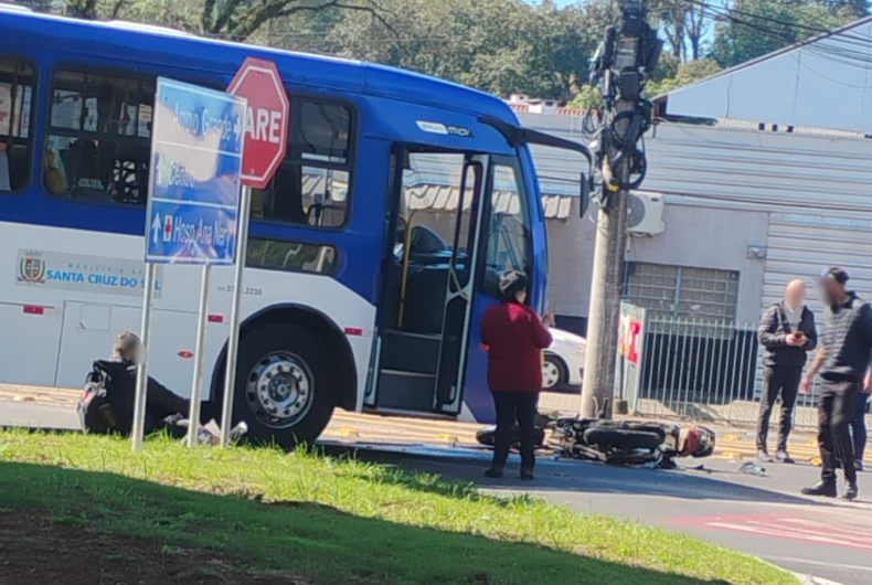 Uma motocicleta e um ônibus urbano se envolveram em um acidente de trânsito por volta do meio-dia desta terça-feira, 12, na parte inferior do viaduto do Bairro Arroio Grande, em Santa Cruz do Sul. Devido à colisão, o condutor da moto teve lesões leves.