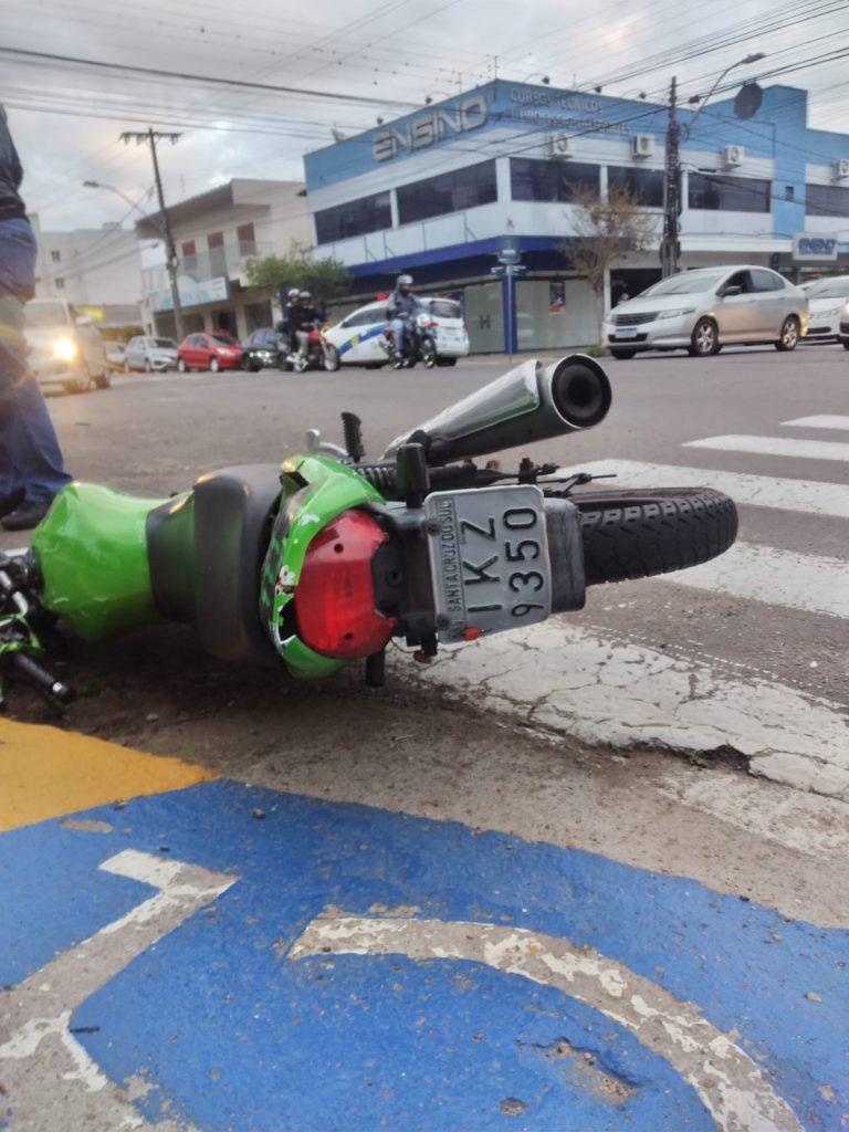 Um acidente envolvendo um carro e uma motocicleta ocorreu no fim da tarde desta sexta-feira, 10, na esquina das ruas Fernando Abott e Venâncio Aires, no Centro. A colisão foi por volta das 17h50, quando a motocicleta trafegava pela Venâncio e o outro veículo, um Palio cinza, ia pela outra rua.