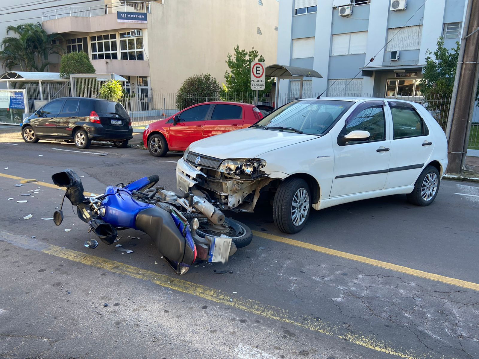 Um motociclista ficou ferido após se envolver em um acidente de trânsito na manhã desta segunda-feira, 13, no Centro de Santa Cruz. A colisão entre a moto Honda e um carro Fiat Pálio aconteceu na Avenida João Pessoa, próximo ao cruzamento com a Rua Coronel Oscar Jost.