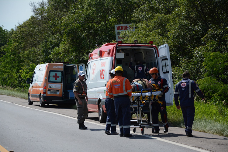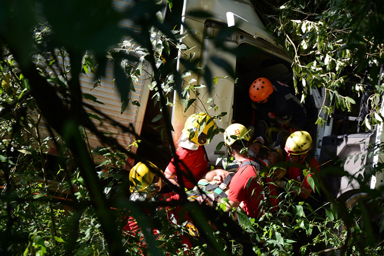 O motorista de um caminhão baú, com placas de Canoas, teria perdido o controle do veículo, descido um barranco e colidido em árvores. O condutor de 46 anos, que não teve a identidade revelada, ficou machucado e com as pernas presas nas ferragens.