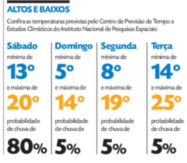 LEIA MAIS: Previsão do tempo: fim de semana deve ser de altos e baixos na temperatura