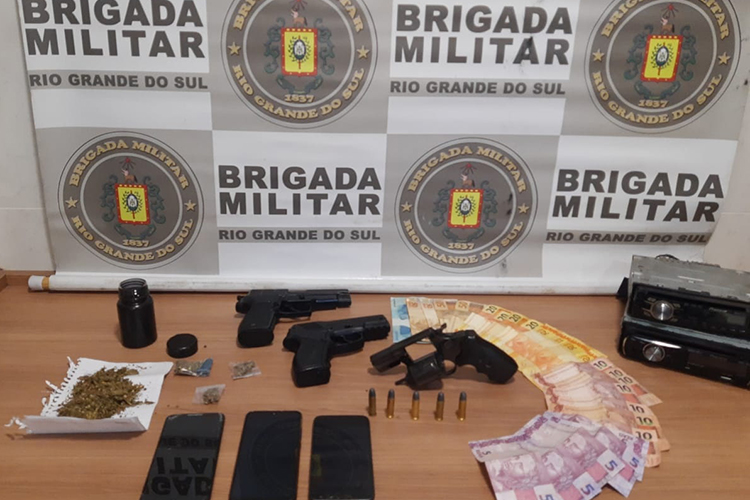 Nas proximidades, foram encontrados um revólver, com numeração apagada e cinco munições, e dois simulacros de arma. Também foram apreendidos três celulares, um caderno que teria anotações relacionadas ao tráfico e R$ 605,00 em dinheiro.