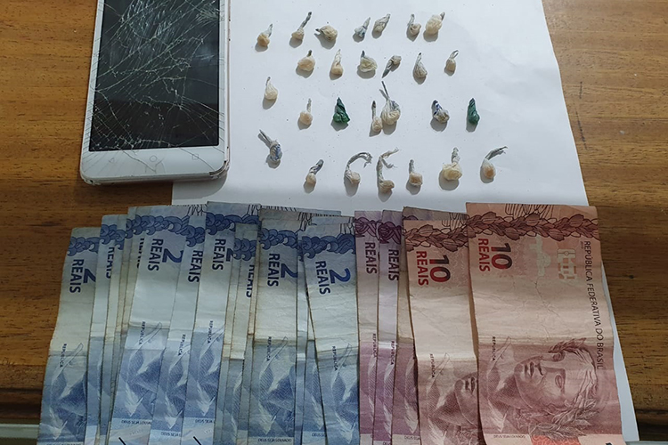 Com ela foram apreendidas 27 pedras de crack, um celular e R$ 69,00. A jovem acabou presa e encaminhada à Delegacia de Polícia para registro.