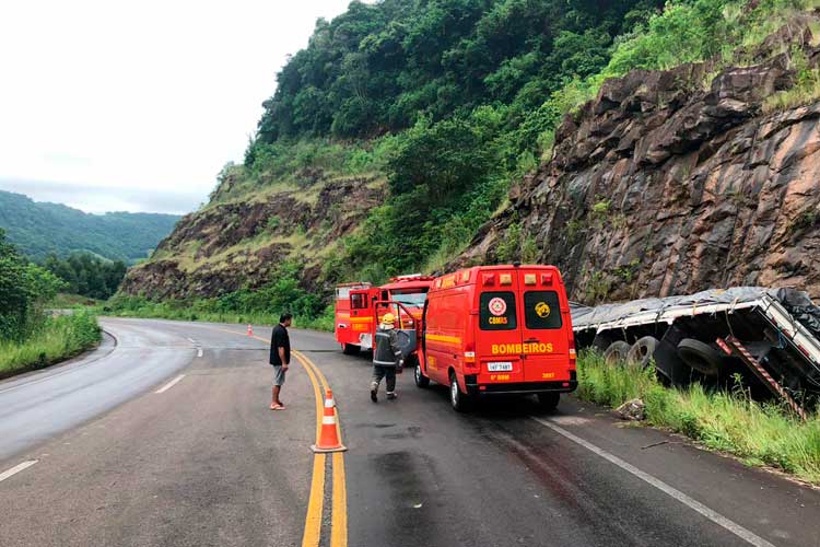 Mulher fica presa às ferragens em acidente com caminhão na RSC-153