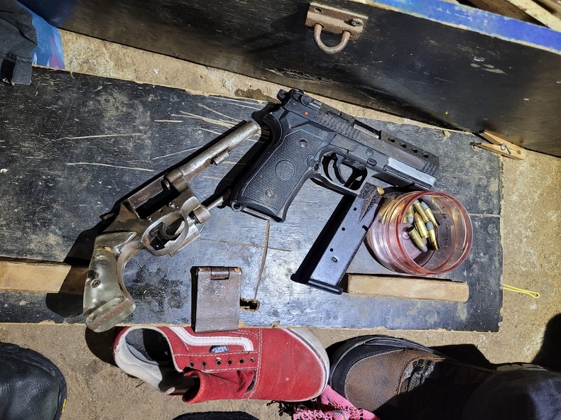 Ela é apontada como a guardiã das armas do grupo criminoso. Uma pistola calibre 9 milímetros da marca Girsan, com a numeração raspada; um revólver prateado calibre 32, também com numeração raspada; e munições foram localizados no interior de uma caixa de ferramentas, que estava cadeada dentro de um quarto. No imóvel ainda foram encontradas seis buchas de cocaína e 200 petecas menores da mesma droga, além de munições de vários calibres.