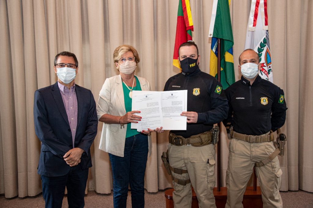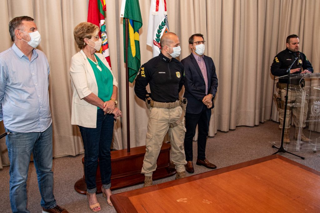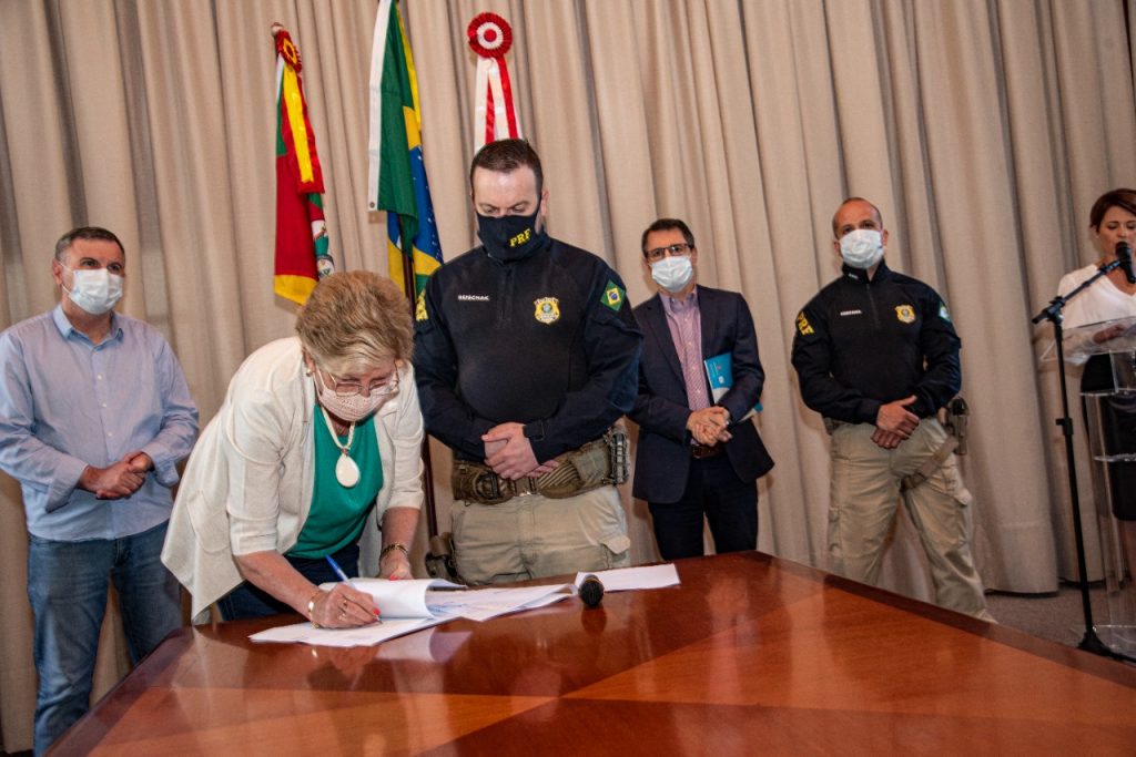 A prefeita de Santa Cruz do Sul, Helena Hermany, assinou na manhã desta terça-feira, 30, um acordo de cooperação técnica, nas áreas de inteligência e tecnologia, com a Superintendência da Polícia Rodoviária Federal (PRF). O município é o primeiro do interior do Estado a firmar o acordo, que integra as ações do Programa Pacto Santa Cruz pela Paz. A assinatura ocorreu em uma cerimônia no Salão Nobre do Palacinho e contou com a presença de autoridades da segurança pública, secretários, vereadores, convidados e imprensa.