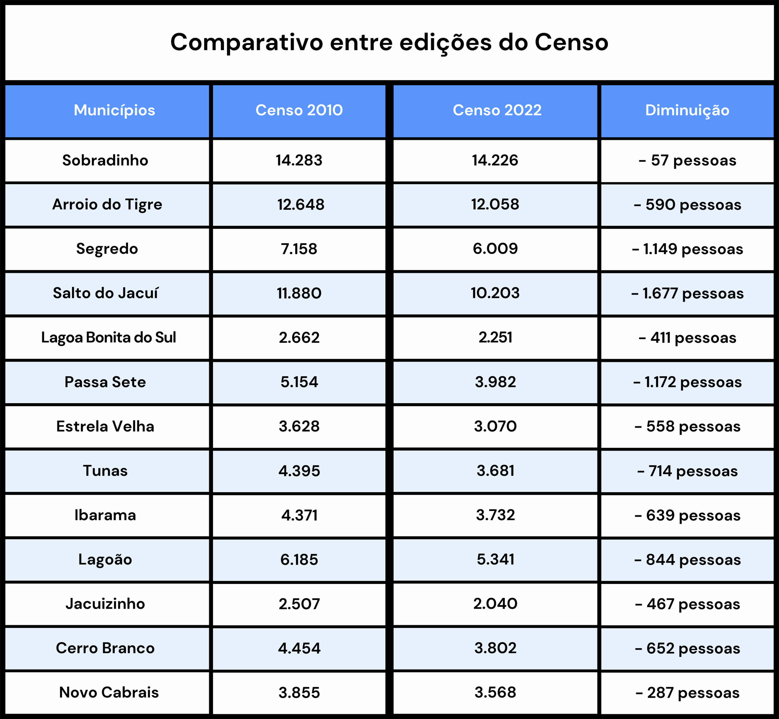 Na lista dos 10 municípios gaúchos que mais perderam população percentualmente estão Passa Sete, com uma queda de 22,57% em comparação a 2010; e Jacuizinho, com uma queda de 18,63%.
