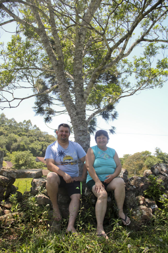 Dona Lorena explica que os muros das terras eram usados para separar os animais, que sempre foram presença garantida na propriedade. “Quando meu pai ainda era vivo, apenas um ano a gente plantou tabaco. Desde então, trabalhamos com cana para produção de schmier e outros produtos. Nós só fizemos alimentos.” Em um dos muramentos da propriedade ela contempla a paisagem, ao lado do esposo Ivo, da neta Aline Raquel Fry e da cachorra Belinha. “Ela tem que vir também para sair na fotografia”, anuncia Lorena.