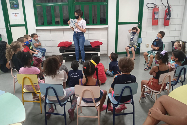 Aluna do 8º ano, Maria Janaína, contando histórias para os alunos da pré-escola, da Emef Menino Deus