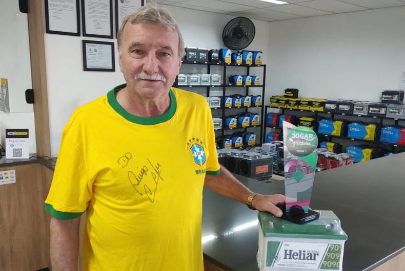 Em 2022, Ivo foi premiado como maior revendedor do Estado, da marca de baterias Heliar. O prêmio foi uma viagem para a Copa | Foto: Divulgação/GS