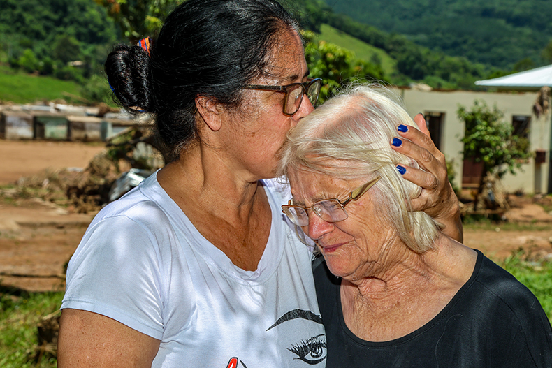 Ao lado de sua cuidadora e amiga, Lenite se emocionou ao relembrar da situação. “A água levou tudo o que eu tinha. Levou minha história, meus documentos e fotos de família”, disse, em meio às lágrimas.