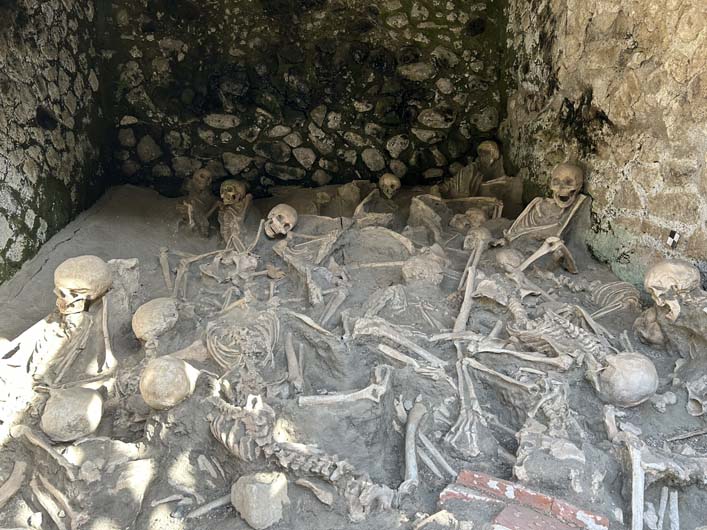 A primeira fase da erupção de 79 d.C. atingiu Pompeia e foi um sinal de alerta para evacuar Herculano, atingida horas depois por uma onda piroclástica (cinzas e gases de até 250 graus centígrados) que invadiu a cidade a 160 km/h. Alguns dos 5 mil habitantes que ainda tentavam escapar via marítima – era uma cidade costeira na época – pereceram nas docas, onde mais de 300 esqueletos foram desencavados. A rapidez do evento e a alta temperatura preservaram estruturas de madeira, portas, artefatos, esculturas, móveis e até alimentos usados pelos romanos há 2 mil anos.