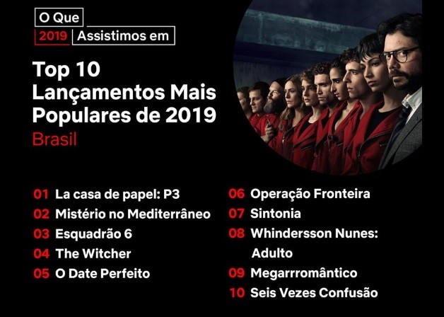Segundo a companhia, o ranking é formado “pelo número de contas que assistiram a pelo menos 2 minutos de uma série, filme ou especial nos primeiros 28 dias de seu lançamento na Netflix em 2019”.