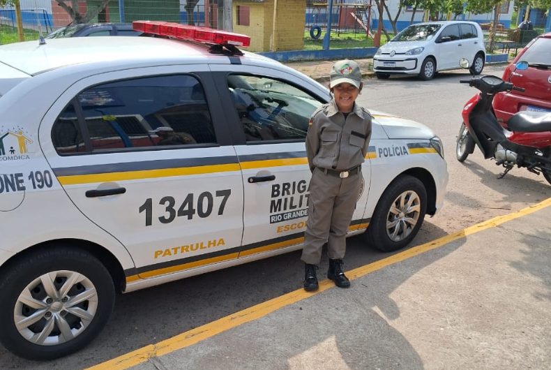 A pequena Emanuelle Miranda, de 6 anos, realizou um sonho na manhã desta quarta-feira, 23. Em atividade do Dia da Profissão, proposta pela UP Educação, os alunos foram incentivados a irem vestidos com uniformes da carreira que desejam ter quando crescerem. Emanuelle então pediu para a mãe, Adriane Zimmermann, de 24 anos, para ir como policial militar.