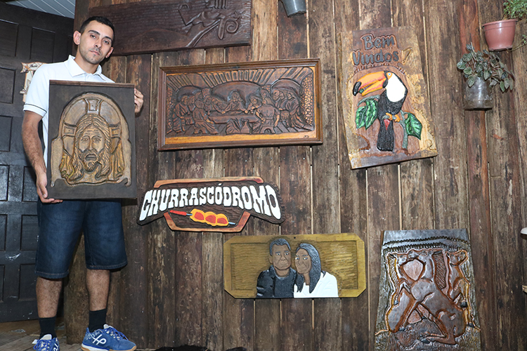 Em um momento de dificuldade, John da Silva encontrou sua vocação com o entalhe em madeira. O morador de Santa Cruz do Sul, de 29 anos, trabalhava em uma serralheria e pagava aluguel, quando deixou o emprego para construir sua casa própria. Ao lado da esposa Caroline da Silva e do filho Lorenzo, de 7 meses, na moradia que ergueu no Bairro Santuário, ele passou a desenvolver peças artísticas em madeira, que se tornaram o seu sustento.