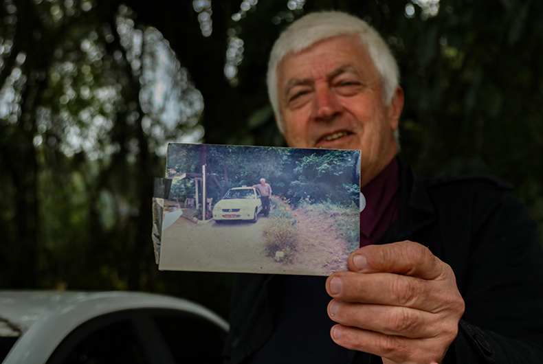 Em seu tradicional ponto, Clavio Franke posa ao lado de seu 12o companheiro de trabalho; no detalhe, foto semelhante registrada com o primeiro carro