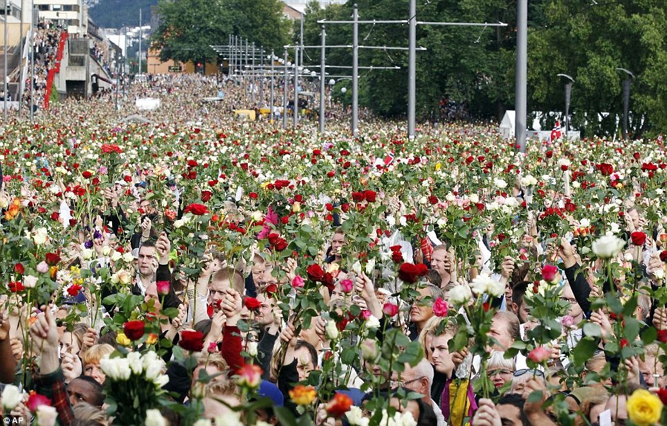 Desde as primeiras horas, a forma com que o país reagiu chamou muito a atenção, com milhares de pessoas pelas ruas da capital cantando e carregando rosas. No tapete de flores criado em frente à Catedral de Oslo, aparecia a seguinte mensagem: “Se um homem pode demonstrar tanto ódio, imagine quanto amor nós podemos expressar juntos”. O primeiro-ministro Jens Stoltenberg repetia incansavelmente que não deixaria que os valores do país fossem abalados, e que a resposta à violência seria mais democracia, mais abertura e maior participação política.