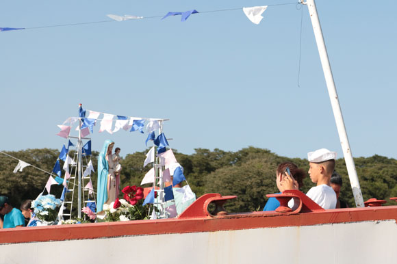 Um barco areeiro decorado com bandeirolas brancas e azuis recebeu a imagem da protetora dos marinheiros e foi seguido por outros cinco no Rio Jacuí, assim como uma dezena de embarcações menores. Os devotos jogaram flores, acenderam velas e oraram para agradecer as graças atendidas e renovar os pedidos para mais um ano.