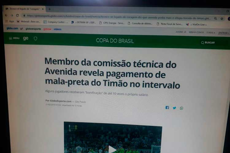 O título adulterado, no entanto, afirma que “Membro da comissão técnica do Avenida revela pagamento de mala-preta do Timão no intervalo”. Ainda é possível conferir, na linha de apoio, a informação falsa de que “Alguns jogadores receberam “bonificação” de até 10 vezes o próprio salário”.