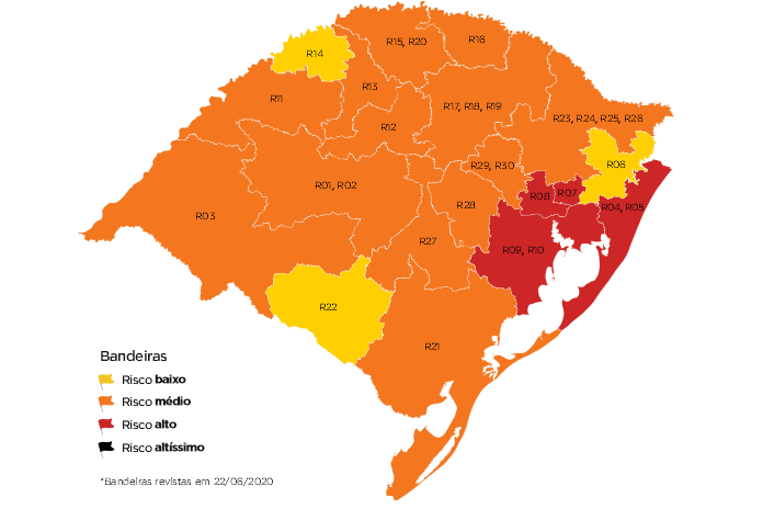 As demais regiões, classificadas na maioria em laranja – 13, no total –, e apenas três em amarelo (risco baixo), permanecem com os níveis divulgados preliminarmente. O mapa pode ser consultado em https://distanciamentocontrolado.rs.gov.br. A sétima semana de vigência do Distanciamento Controlado começa nesta terça-feira e segue até as 23h59 de segunda-feira, 29.