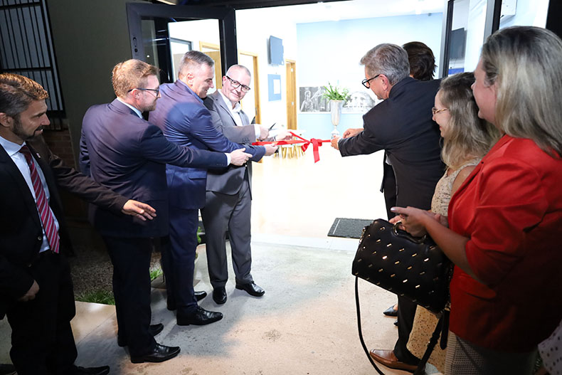 Junto de professores e de autoridades, o reitor Rafael Frederico Henn (centro) cortou a faixa inaugural em cerimônia na noite dessa terça-feira