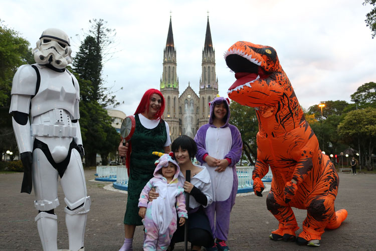 A Procissão das Criaturas não tem restrição de idade e envolve cada vez mais as famílias santa-cruzenses. Na tarde de ontem, a avó Esther Ramos, 58 anos, as netas Vitória, 12, e Ana Júlia Dreher, 3, a filha Gabriela de Medeiros, 19, e o namorado Leonardo Worm, 20, (o T-Rex) se reuniram na Praça Getúlio Vargas para fazer um “aquece”. Primeira da família a se envolver com o universo geek, Gabriela, que também é fotógrafa especializada em cosplay, estava trajada de Sasuke Uchiha (Naruto). “Eu sempre gostei de assistir a anime e comecei a frequentar os eventos espalhados pelo Estado.” Na casa de Gabi, o namorado ajuda a escolher as fantasias e a mãe faz questão de participar. “É uma forma de unir a família e ‘escapar’ um pouco da realidade, que anda tão pesada. Confesso que estou adorando”, complementou a aposentada Esther, trajada de Kashina (também Naruto). Todos, é claro, já confirmaram presença na Feira e na Procissão e comemoram o fato de poder curtir um evento desse porte na própria cidade.