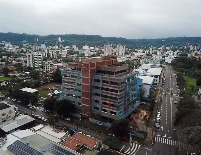 O projeto já se encontra com sua parte estrutural pronta, com os sete andares já concretados. No segundo pavimento, já foram concluídos o PPCI e as instalações elétrica, de climatização e das aberturas. Atualmente, as equipes da empresa K&G Construções Ltda., vencedora da licitação, trabalham em diferentes aspectos. Conforme o encarregado geral da obra, Laudemir Marin, o foco nessa fase está no fechamento em alvenaria, reboco e a colocação de porcelanato do sexto andar; e na execução da alvenaria, das escadarias e acabamentos em geral.