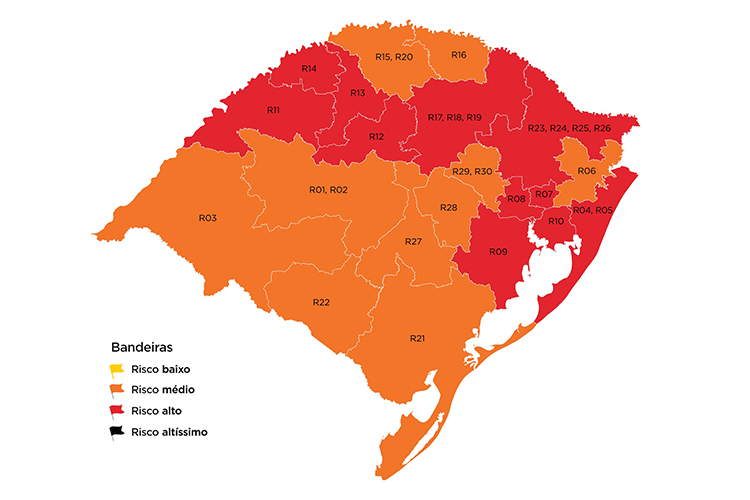 Com níveis de hospitalização por Covid-19 e de internações em leitos de UTI que não eram registrados no mínimo há dois meses, o mapa preliminar da 28ª semana do Distanciamento Controlado, divulgado nesta sexta-feira, 13, tem 11 regiões do Rio Grande do Sul com classificação de bandeira vermelha, o que representa alto risco epidemiológico.