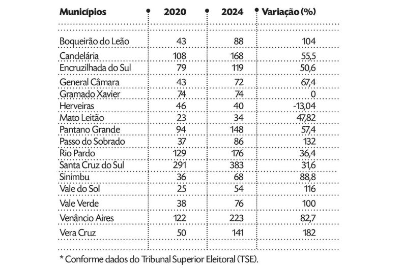 Somente um dos 16 municípios avaliados pela Gazeta do Sul apresentou redução. Em Herveiras eram 46 jovens eleitores; agora são 40. Gramado Xavier manteve os mesmos 74. Enquanto isso, outros tiveram expressivo aumento, como é o caso de Vera Cruz. Em 2020, 50 adolescentes estavam aptos a votar; agora são 141, representando crescimento de 182%.