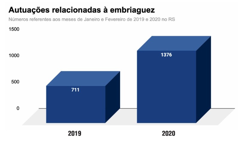 Em janeiro e fevereiro de 2020, os Policiais Rodoviários Federais autuaram 1.376 condutores por infrações relacionadas à embriaguez ao volante no Rio Grande do Sul. Em 2019 foram 711, um aumento de quase 100% nas autuações por uma das infrações que geram maior risco de acidentes.