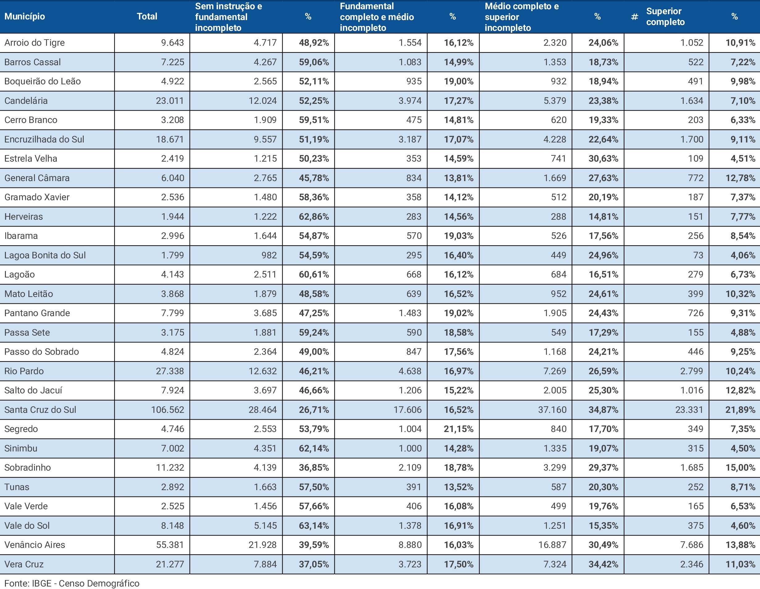 O Instituto Brasileiro de Geografia e Estatística (IBGE) divulgou nesta semana os dados do Censo Demográfico 2022: Educação – Resultados Preliminares da Amostra. O levantamento aponta quantas pessoas frequentam as instituições de ensino, de acordo com a faixa etária, grau de escolaridade, gênero e cor. O País chegou à média de 18,4% de cidadãos com mais de 25 anos e Ensino Superior completo. Em Santa Cruz do Sul, esse índice é de 21,89%.