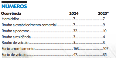 Os roubos também apresentam estabilidade no município. No primeiro semestre foram, nove ocorrências do gênero contra estabelecimentos comerciais, dez a pedestres, quatro a residências e três roubos de veículos. Quanto aos furtos, houve 107 arrombamentos e 36 de veículos.