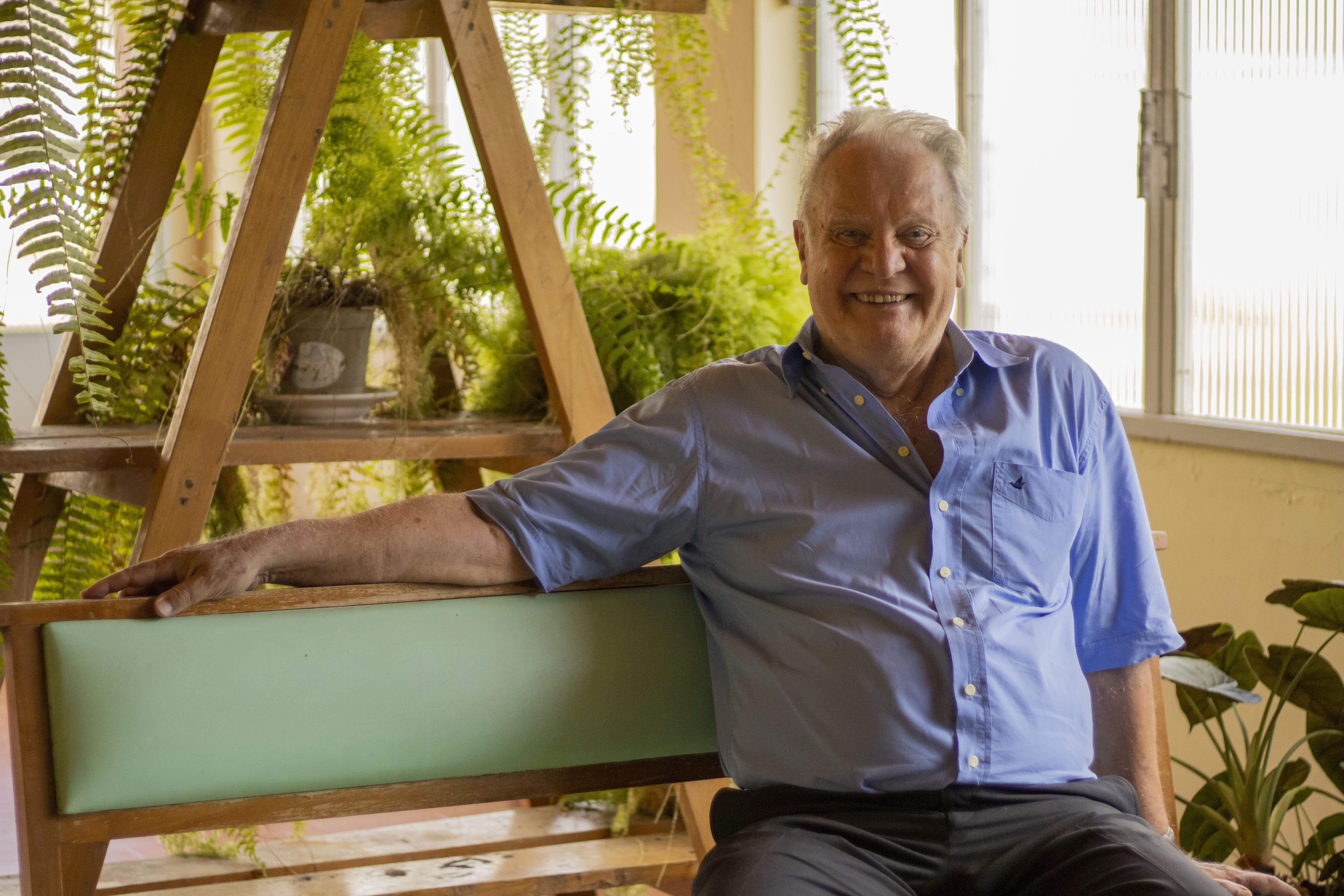 O professor e escritor santa-cruzense Flávio René Kothe, 78 anos, na casa de sua família, durante uma visita recente a sua terra natal. | Crédito: Rafaelly Machado
