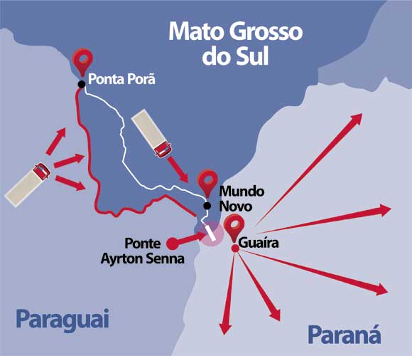 3. O grande desafio da repressão é interceptar as cargas ainda nas vias vicinais. Quando conseguem chegar à 163, rodovia com grande circulação de veículos grandes por causa das safras de grãos do Mato Grosso, os criminosos misturam-se ao fluxo normal, tornando a identificação bem mais difícil. Do Mato Grosso do Sul, os veículos ingressam, por meio da Ponte Ayrton Senna, na região de Guaíra, no Paraná, e de lá seguem para todo o País.
