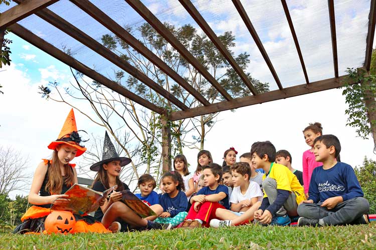 E engana-se quem pensa que as meninas somente relataram o conteúdo do livro: literalmente, elas se transformaram nos personagens da obra infantil. Vestidas de bruxas, Maria Eduarda e Brenda surpreenderam os pequenos, que as esperavam embaixo do pergolado instalado no pátio da Normélio Boettcher.