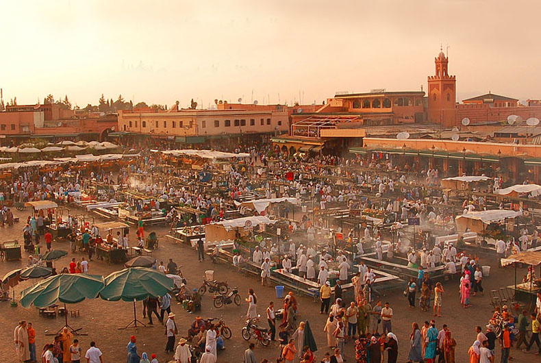 Jemaa e-Fna, famoso mercado ao ar livre que faz a fama de Marrakesh (ou Marraquexe, como opta por grafar o livro) e de todo o Marrocos para o mundo, num encontro de culturas entre o mundo árabe, a África e a Europa | Foto: Divulgação