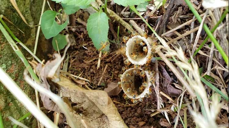 Pessoas que não conhecem o tabaco por vezes associam essa cultura com agrotóxico, defensivo agrícola. Mas não é nada disso. Bem ao contrário. O tabaco é uma das culturas que menos usa defensivo agrícola. Aqui na propriedade, bem ao lado da lavoura, a dois metros dela, há anos existem ninhos de abelhas-mirim, as pequeninhas (foto acima), que são muito frágeis, qualquer coisinha e já morrem. Pois ali elas estão firmes e fortes, ano após ano, e a gente plantando tabaco bem ao lado. É um sinal de que os poucos defensivos que a gente usa não lhes fazem qualquer mal. Fora os ninhos de passarinho que se encontra no meio da lavoura. É uma dádiva estar trabalhando e de repente encontrar os ninhos escondidos junto aos pés de tabaco, usando as folhas como proteção. É comum encontrar ninhos de tico-tico, sabiá ou sangue-de-boi nas lavouras de tabaco. Outra coisa bastante comum de se achar é lebre, bem como outros animais. Por vezes, claro, também vem o susto, quando se encontra uma cobra escondida sob as folhas, junto da planta. É um risco que o agricultor corre, de ser picado por uma serpente dessas. Mas faz parte.