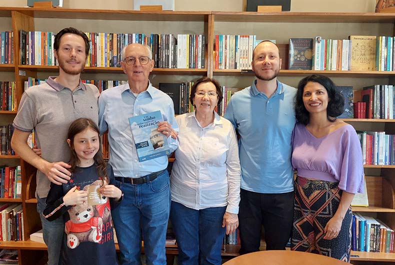 Aldino na Iluminura, em novembro de 2023, com a esposa Eli Maria, os filhos Felipe e Leandro, a nora Ana Caroline e a neta Joana