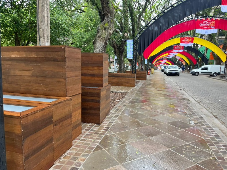Nesta sexta-feira, 3, mesmo com tempo chuvoso, os trabalhadores atuam no local para concluir a calçada do lado oposto da Praça Getúlio Vargas, lado com o maior volume de trabalho a ser realizado. Além disso, os arcos já estão instalados no local. A colocação de floreiras e bancos também foi iniciada, bem como na primeira quadra, entre as ruas Júlio de Castilhos e 28 de Setembro, onde a quadra já está pronta.