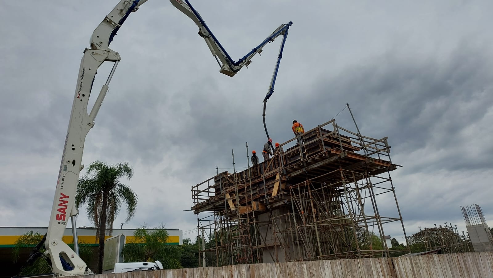 Mais uma etapa da obra no Viaduto do Arroio Grande foi realizada nesta quinta-feira, 4. O consórcio vencedor da licitação, formado pelas empresas Giovanella e Porto Beton, executou a concretagem da viga travessa sobre os pilares P4 e P5. De acordo com o engenheiro Fábio Vargas Vieira, as próximas travessas a serem concretadas serão sobre os pilares P2 e P3, que já estão recebendo os serviços de cimbramento e montagem de armaduras.