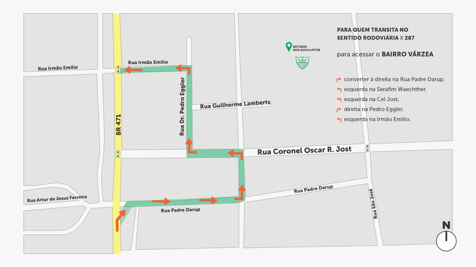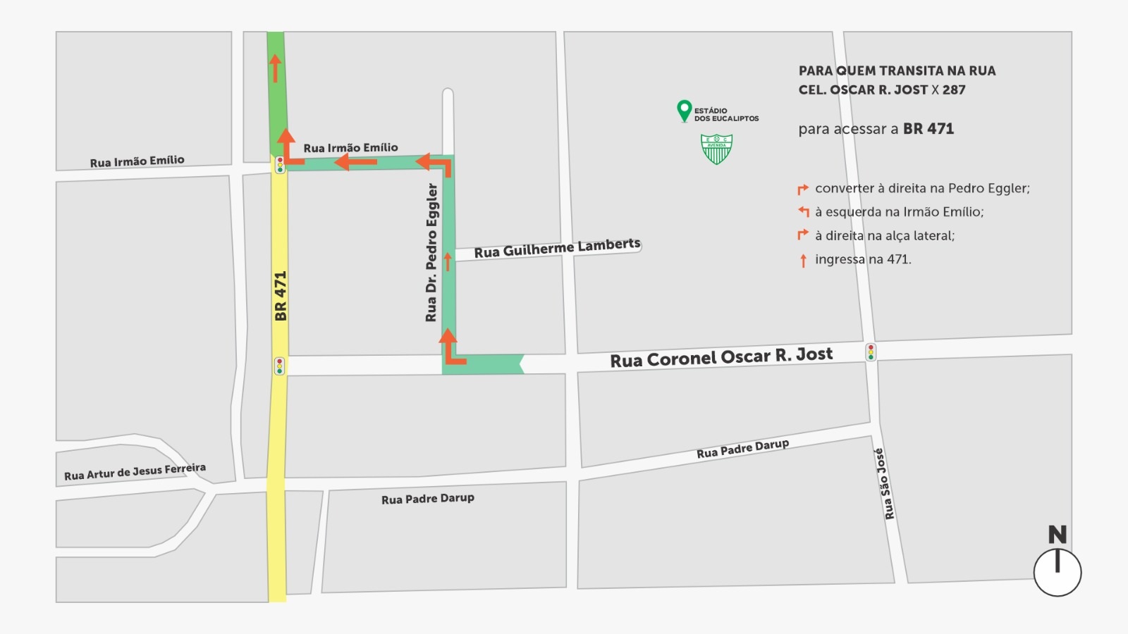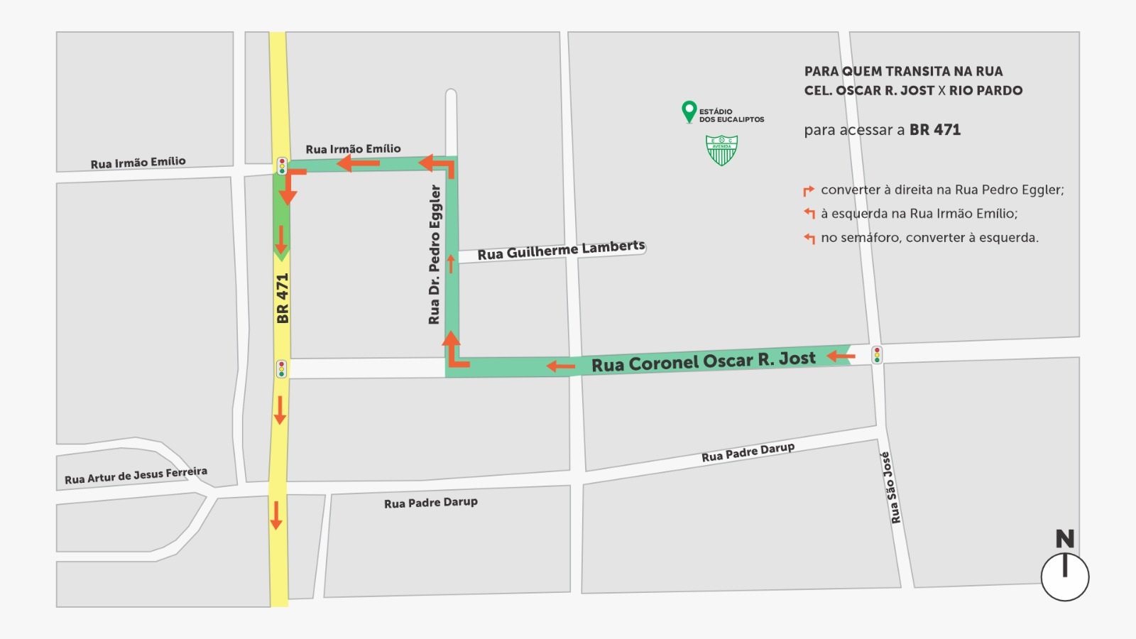 - Para acessar a rodovia federal é preciso entrar à direita na Rua Pedro Eggler, depois pegar a esquerda na Irmão Emílio e à direita na alça lateral para ingressar na BR-471 em direção à rodovia estadual.