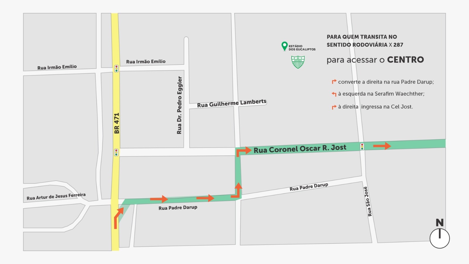 - Para acessar o Centro, o condutor deve converter à direita na Rua Padre Darupp, à esquerda na Serafim Waechter e à direita ingressar na Oscar Jost.