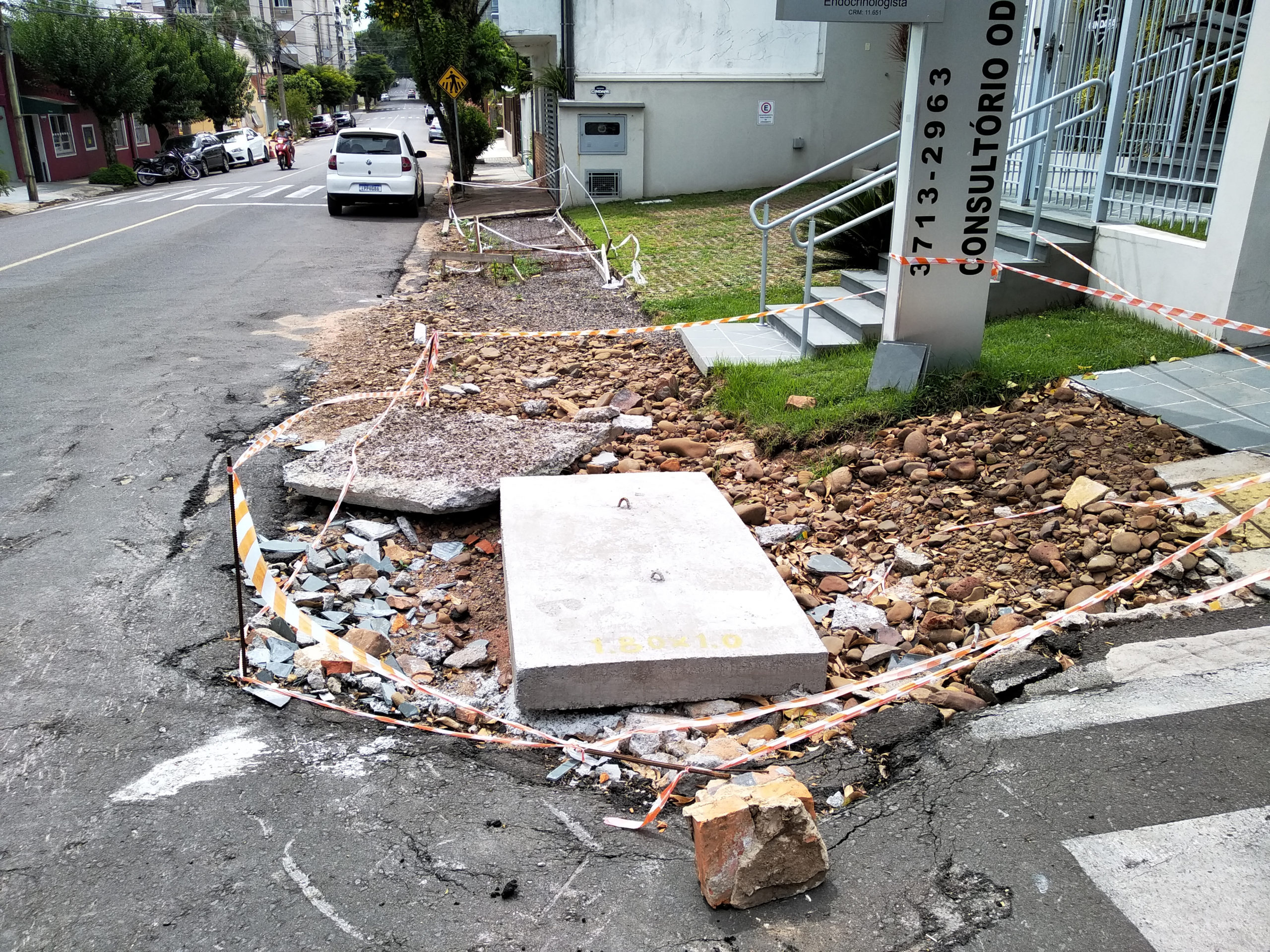 A Gazeta recebeu nesta semana queixas de leitores em relação ao estado da esquina entre as ruas Gaspar Silveira Martins e Jorge Hoelzel. Segundo os relatos, a enxurrada do dia 28 de janeiro causou danos na tubulação pluvial e na calçada.