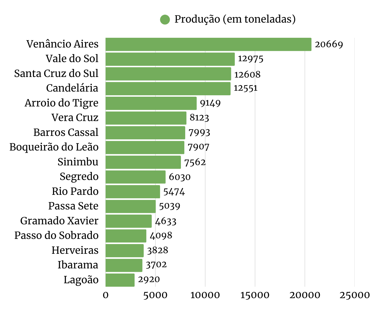Venâncio Aires se destaca, figurando no terceiro lugar geral, com 20.668,8 toneladas produzidas durante o período por 3.646 famílias. Também tiveram números expressivos Vale do Sol, com 12.975,2 toneladas e 2.609 famílias; Santa Cruz do Sul, com 12.608,3 toneladas e 2.949 famílias; e Candelária, com 12.550,9 toneladas e 2.763 famílias. Os outros municípios da região que figuram no ranking são Arroio do Tigre, Vera Cruz, Barros Cassal e Boqueirão do Leão.