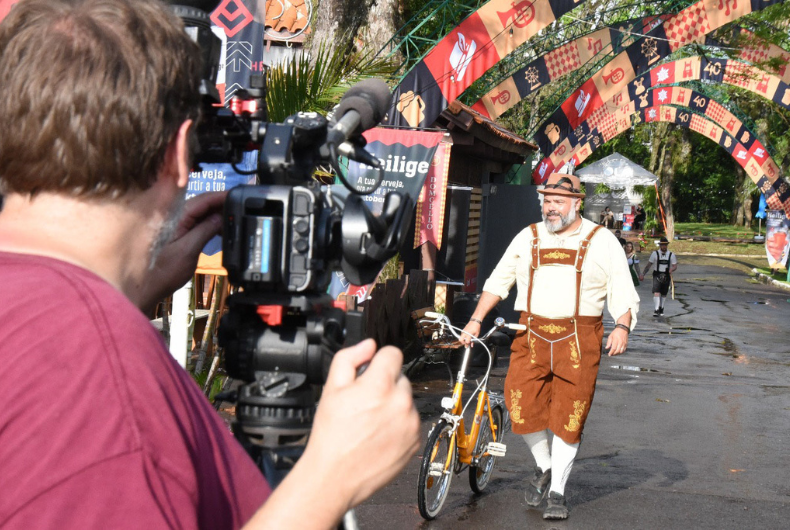 Quem passou pelo palco em frente ao pórtico principal deparou-se com as câmeras montadas em tripés fazendo registros dos visitantes e das apresentações culturais. E testemunharam o personagem do ator Douglas Madenford, vestindo trajes germânicos, passeando com sua bicicleta pelo local.