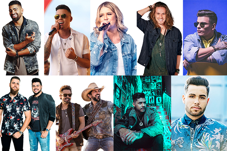 Felipe Araújo – Felipe Araújo nasceu em Goiânia, em 1995. Cresceu em um universo musical sendo influenciado pela presença de cantores sertanejos na família e desde criança demonstrou ter aptidão para música. Iniciou a sua carreira aos 15 anos e depois de integrar duplas com João Pedro e com amigo Zé André, Felipe Araújo atendeu ao pedido do pai e decidiu seguir carreira solo em 2015. Um ano depois, gravou o primeiro DVD de sua carreira em Goiânia, o “1dois3”, com destaque para os sucessos: A Mala é Falsa e Chave Cópia que contam com 180 milhões e 41 milhões de visualizações no Youtube, respectivamente. Em setembro de 2018, a música Atrasadinha atingiu mais de 200 milhões de views e se manteve em 1 º lugar no YouTube, Spotify, Deezer, ConnectMix e Crowley.