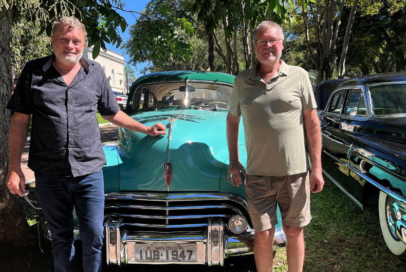 À sombra da Praça da Bandeira, os irmãos Mauro e Paulo Theisen mostravam orgulhosos o Oldsmobile, ano 47, que pertenceu ao seu pai, Waldemar Theisen. Eles contam que o carro foi importado zero quilômetro dos Estados Unidos e que chegou encaixotado ao Brasil. “O primeiro dono foi diretor de uma multinacional aqui de Santa Cruz. O tio do nosso pai era o motorista particular dele e foi a São Paulo buscar. Eles levaram sete dias para chegar de volta em Santa Cruz com o carro”, lembra Mauro. Anos se passaram até que, em 1965, o pai deles conseguiu comprar o veículo, já de um segundo dono. Sete anos depois, por conta da alta taxação de impostos do governo, o Oldsmobile, a exemplo de outros tantos carros importados, ficou parado.