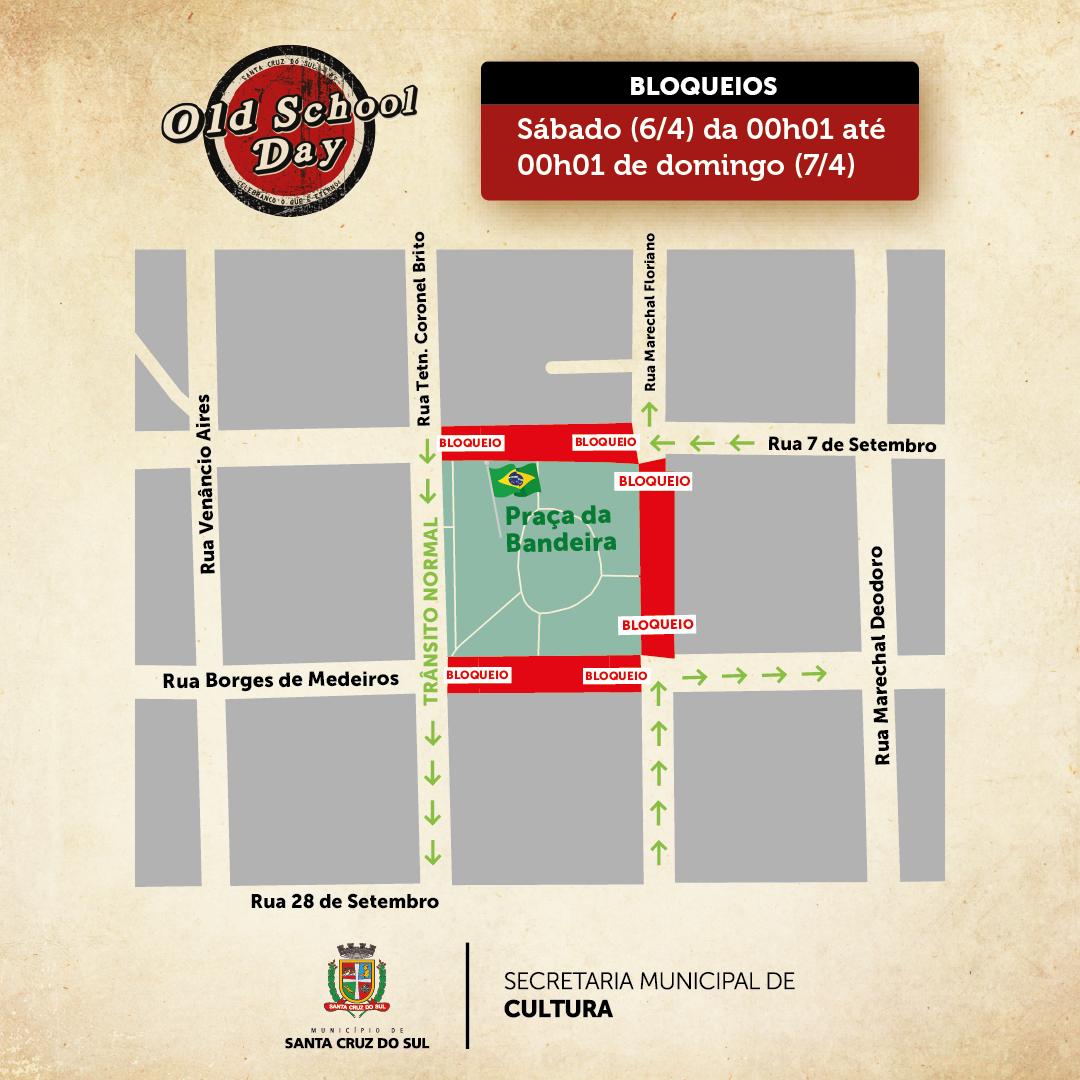 O fim de semana promete muita movimentação na região central da cidade neste sábado, 6, por ocasião da terceira edição do Old School Day. O evento ocorrerá na Praça da Bandeira, conhecida como a praça da prefeitura, e as ruas nas imediações sofrerão algumas alterações. As atrações iniciam às 10 horas e se estenderão até as 22h. Por conta disso, as vias no entorno da praça ficarão bloqueadas para o tráfego de veículos. São elas: Marechal Floriano, Borges de Medeiros e 7 de Setembro, ficando liberada somente a Tenente Coronel Brito.