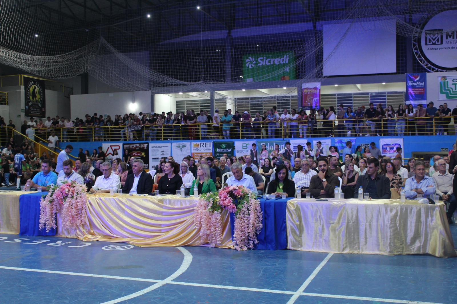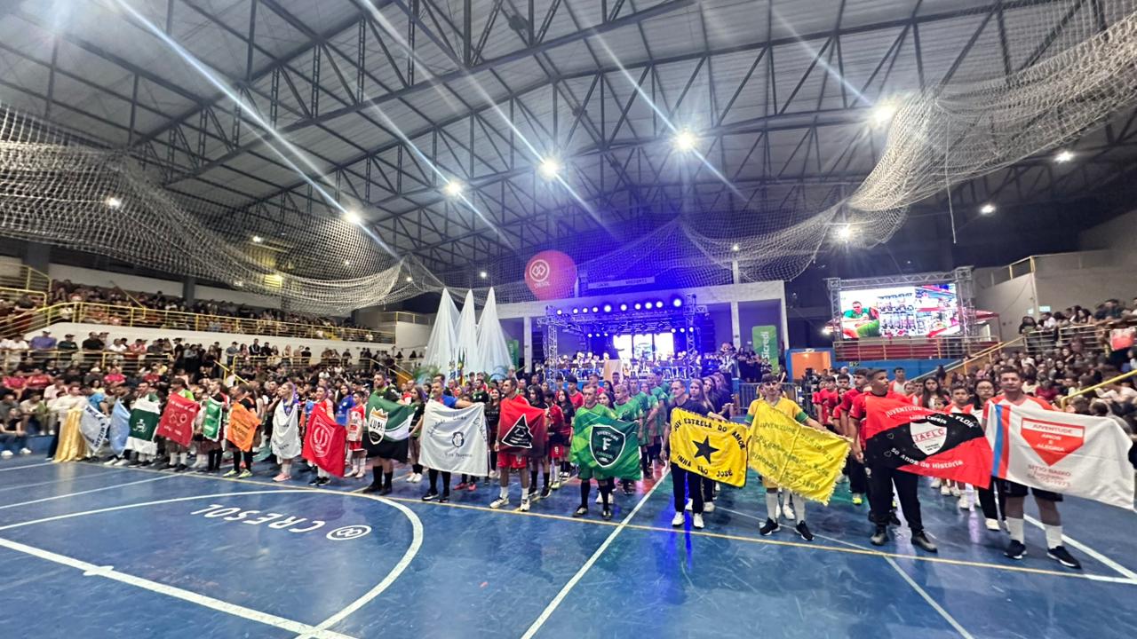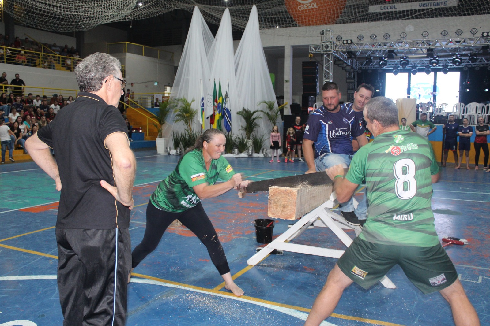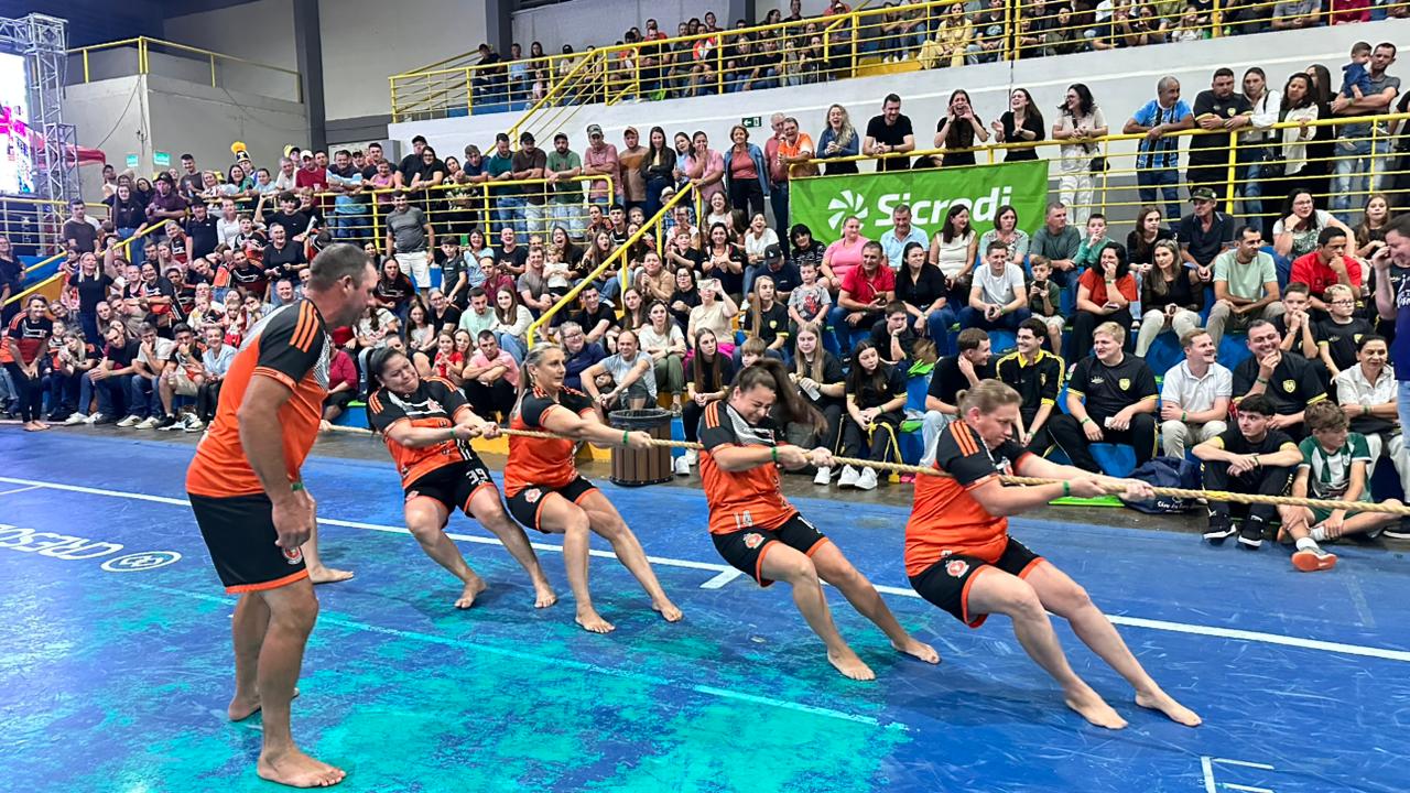 O público lotou as dependências do Ginásio Tigrão para acompanhar e vibrar pelas equipes, que tiveram como primeiras disputas as modalidades do serrote misto e do cabo de guerra.